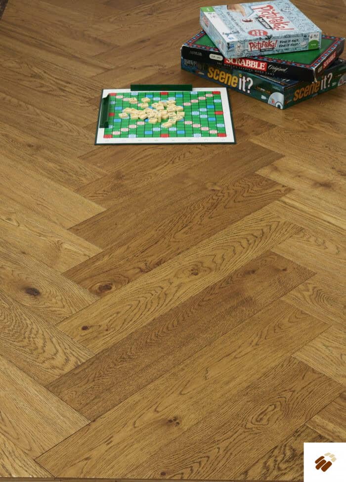 Free Sample – Herringbone Multi-ply H1013A Chatsworth | Oak Hand-Scraped / Brushed / Distressed / Cognac Stained & UV Oiled (15/4 x 120mm)
